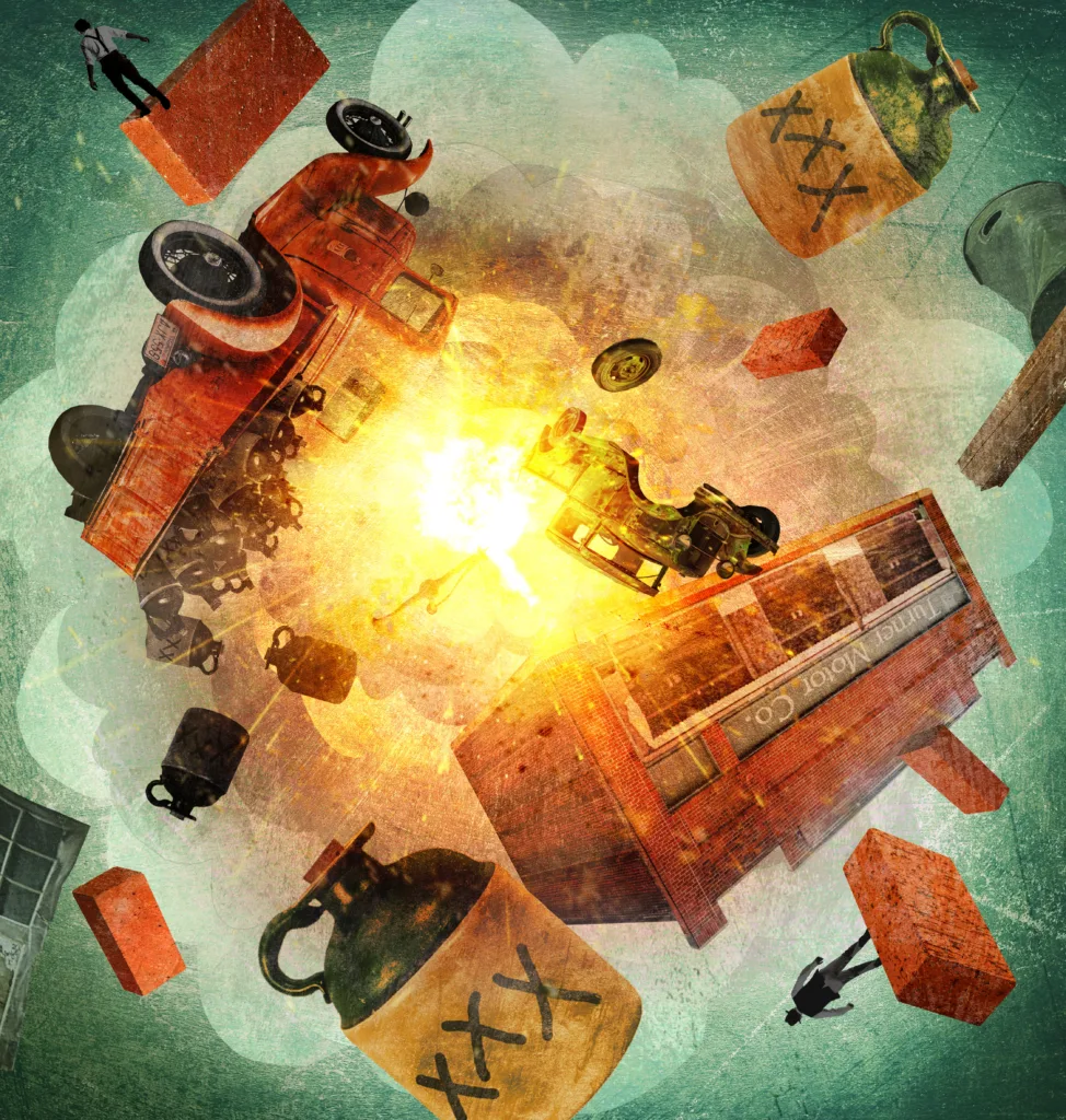 The fuel pump leaked onto the steaming, hot motor. It sparked a chain reaction. The heat caught hold, igniting the engine, flames engulfing the cushioned seats, then spreading to the hidden cargo. The contraband moonshine started to boil, and then ….