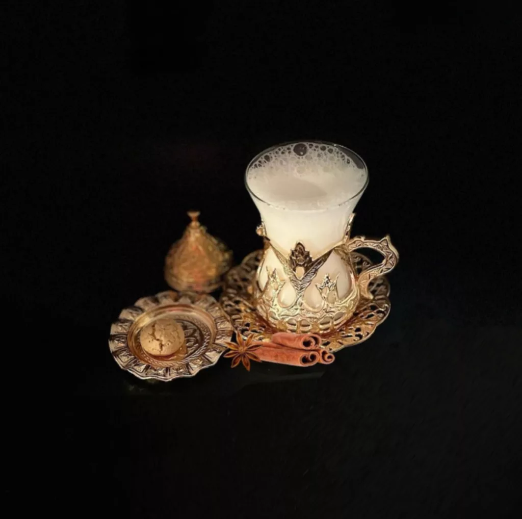 Shake ingredients together to combine and serve in a Turkish tea cup. Garnish with an almond cookie.