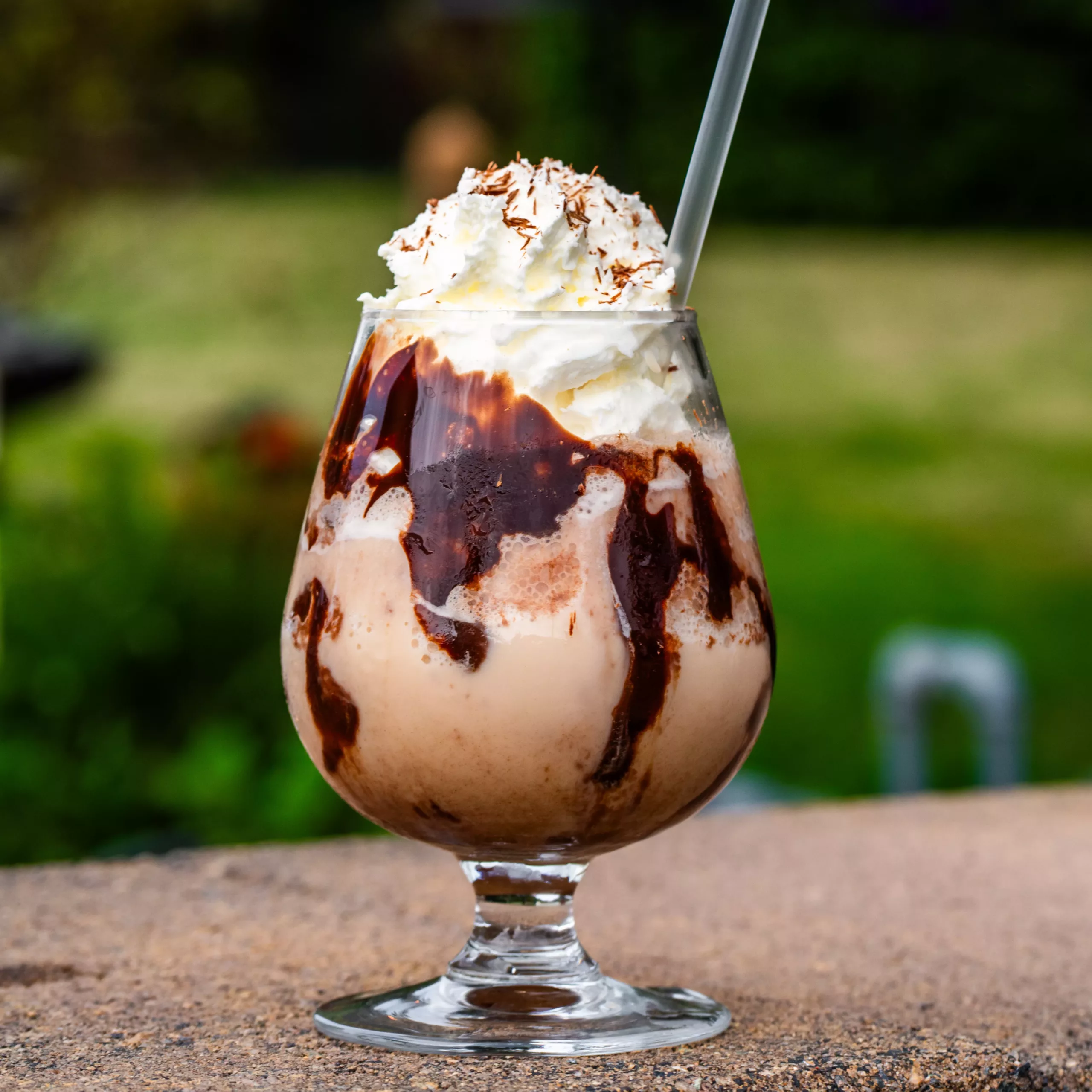 Line a snifter glass with chocolate sauce. Add bourbon, coffee liqueur, and milk, and lightly stir. Top with ice cream, whipped cream, and chocolate.